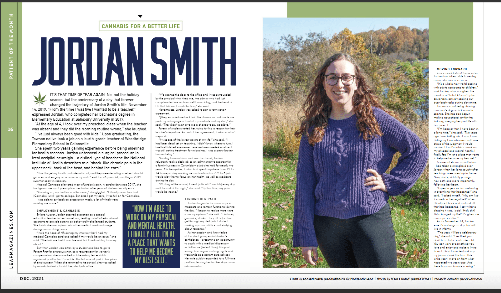 In December of 2021, just before my birthday, I was actually featured in Maryland’s first Cannabis magazine, Maryland Leaf Magazine. This is available monthly in every dispensary across the state for free. I will post the link at the end of this section if anyone would like to see the spread. It was an honor and a blessing to be chosen as the “Patient of the Month” last December. It is amazing to hear a new story every month about how cannabis helps patients and budtenders on a daily basis with so many different medical conditions. See the December 2021 issue of Maryland Leaf Magazine here! Thank you to Wyatt Early for the photos!
