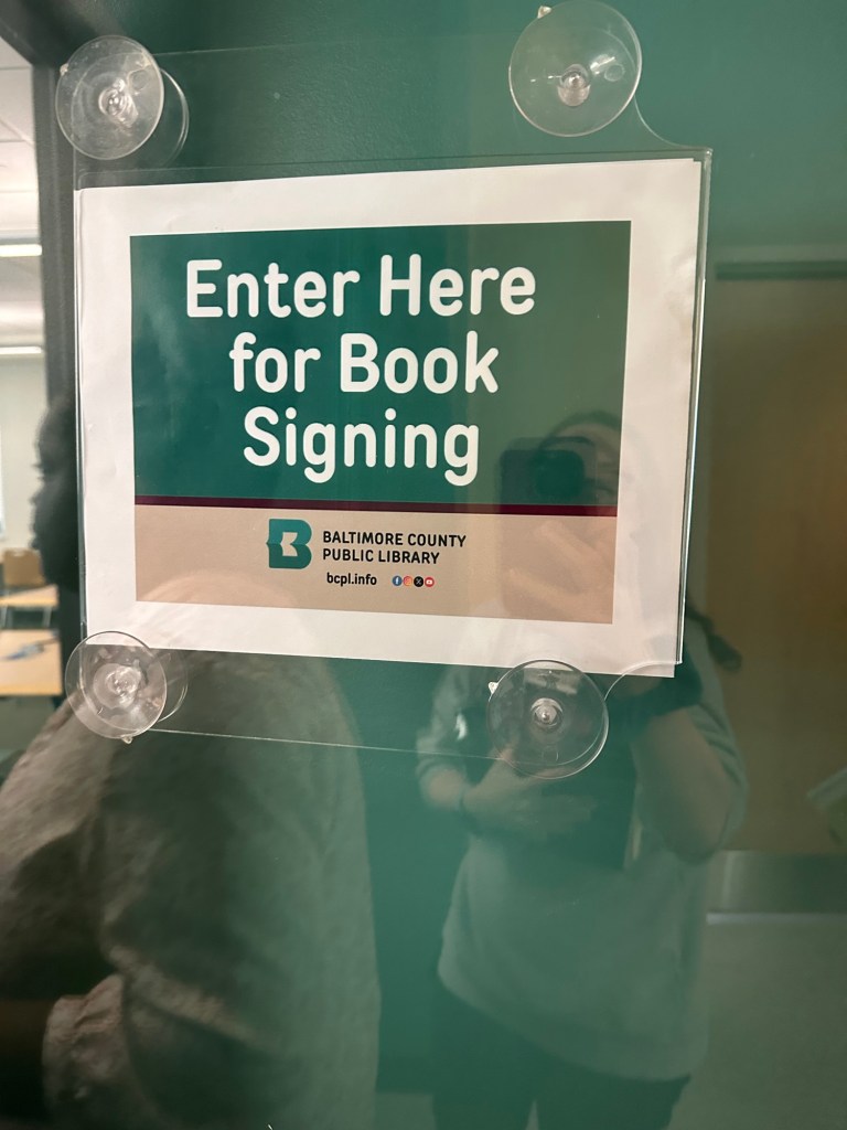 In the afternoon, I drove out to the Owings Mills Library Branch. The signing began at 2pm and I believe I arrived around 1pm. They gave each patron a card with a number – I was number 165. I believe that they had between 200-300 people in attendance at this signing! It was interesting to see the range of ages as well – this was advertised as an adult event, but there were still some kids that attended, and even asked some questions.